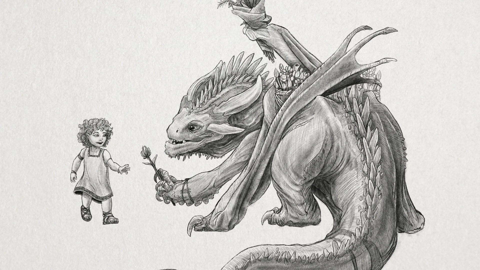 Those watching cheered and clapped. Otukka smiled with a slight bow. The dragon gestured to the little girl to take the flowers. Her eyes lit up, hopping over to take the flowers. Her mother encouraged the polite behavior, suggesting she only take one. The little girl plucked her favorite flower from the dragon’s claws, hopping back to her mother with the flower pressed to her nose.